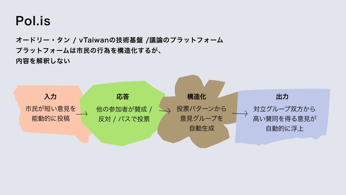 [30] タンのPol.isに関する発言は複数のインタビューで一貫している。P2P Foundation "Democracy Series: Pol.is" (2016) も参照。https://blog.p2pfoundation.net/democracy-series-pol-is/2016/11/30