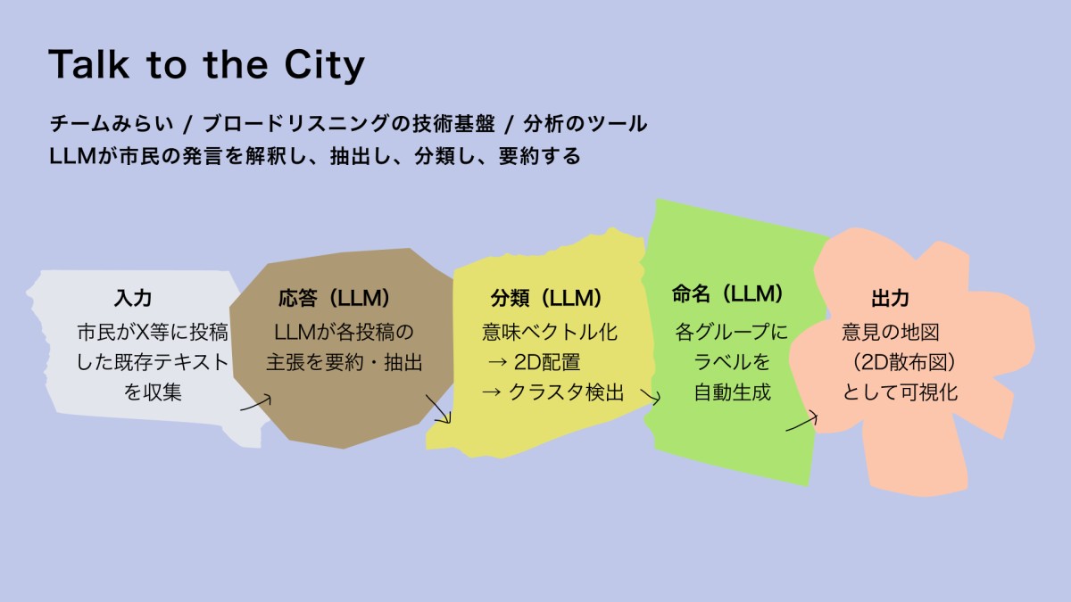 [38] GovTech東京「ブロードリスニングを技術面から大解剖!『2050年代の東京』に向けた意見募集の舞台裏」note, 2025年1月31日、https://note.govtechtokyo.jp/n/ndcf8d6b35939