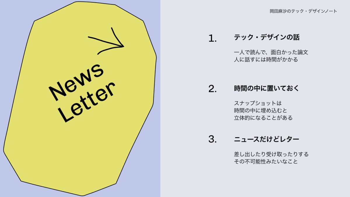 ニュースレターをはじめることにしました。テクノロジーやデザインに軸足を置いたものにする予定です。人文的な要素も出てくるでしょう。テクノロジーやデザインは極めて人文的な領域でもあるからです。