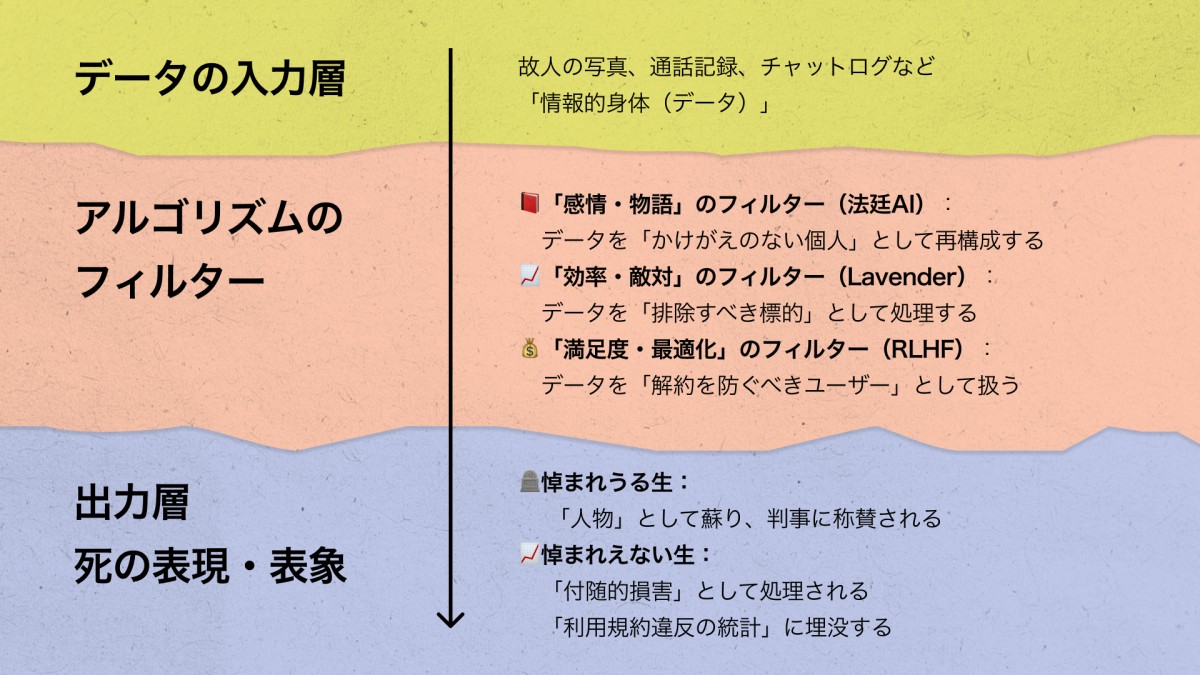 生きている人間が、自分の「情報的死体」を準備し始めている。しかし死を扱うことは、生を扱うことでもある。ステイシー氏のAIは死者の声を再構成したが、書き換えたのは生者の現実——量刑だった。ジャック・デリダが「生-死(la vie la mort)」と記した通り、生は死によって規定され、死は生によって規定される[76]。