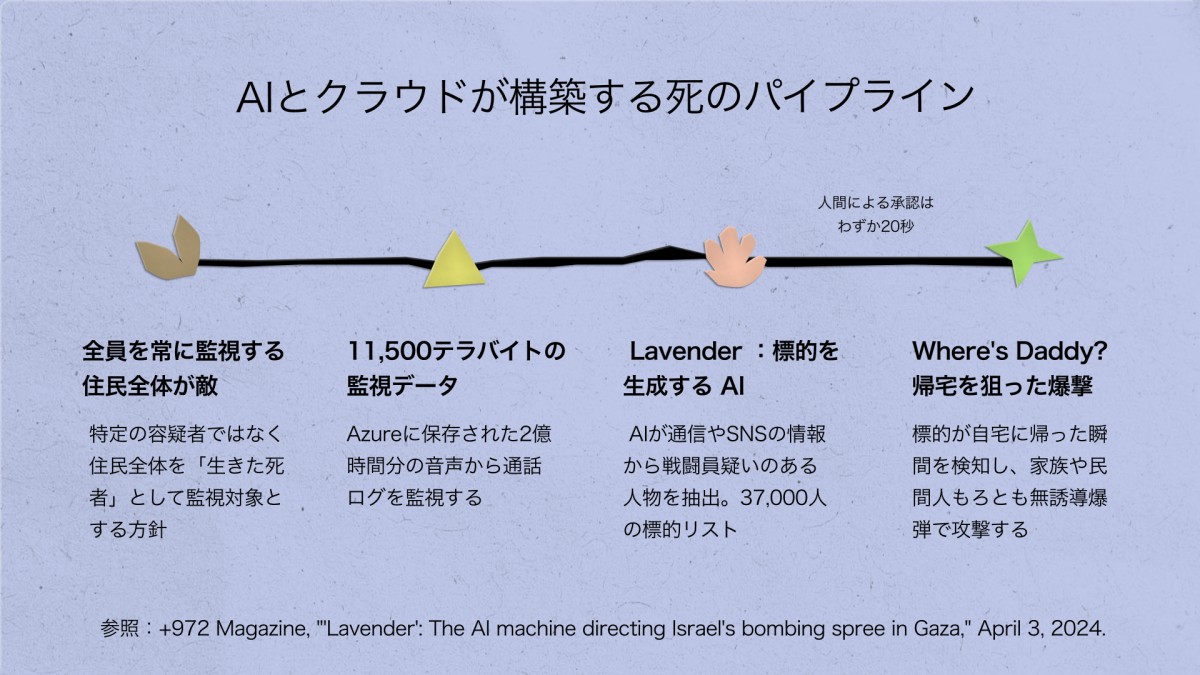 クラウドに蓄積された通話記録が、AIによって標的リストに変換され、別のAIが標的の帰宅を追跡し、家族ごと爆撃する。データの収集から殺害までが、一つのパイプラインになっている。