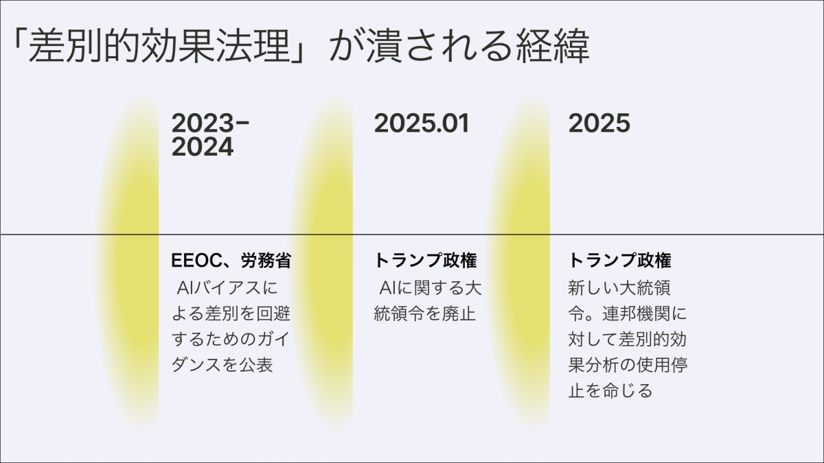 2025年4月、トランプは新たな大統領令を出した[10]。連邦機関に対して差別的効果分析の使用停止を命じる内容だ。意図ではなく結果を見る——その法理論そのものが廃棄された。